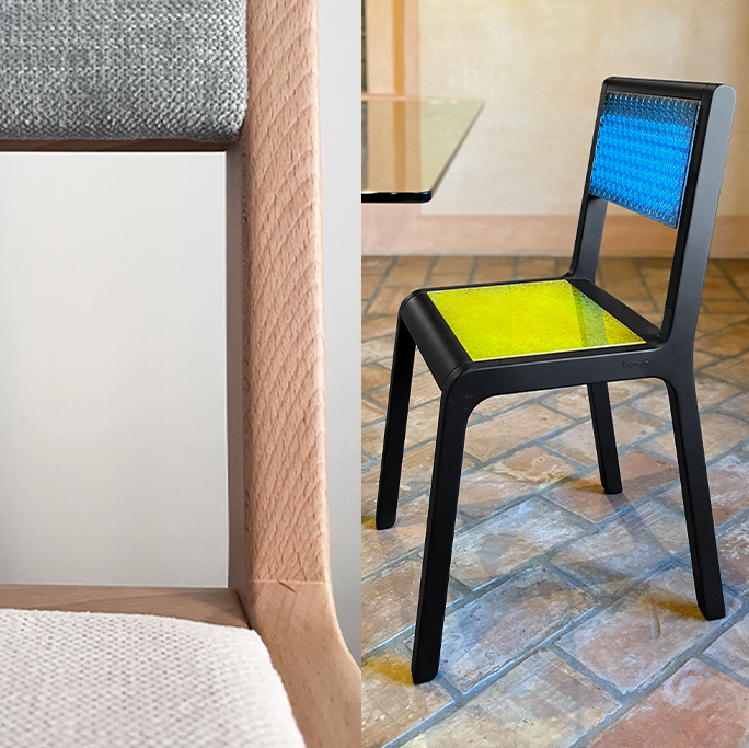 Le sedie ONE spaziano con naturalezza tra interno ed esterno. Schienale e seduta si cambiano all’istante. Il design modulare permette, inoltre, di utilizzare il pannello della seduta anche come personalizzazione del tavolo ONE.